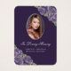 Schöne lila und silberne Gedächtniskarte/Bestattungsgebet-Karte mit einem Foto mit lila Rose und Babyatmen-Blume auf einem dunklen lila Hintergrund.