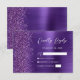 Der links Rand dieser eleganten, modernen Hochzeitsschutzkarte mit RSVP-Gehäuse weist einen lila Imitat-Glitzer-Rahmen auf. Der Titel "Kindly Reply" erscheint in modernen Kalligrafieschriften, mit anpassbarem Text unten in weißen Sans Serif Schriftart auf einem lila Imitat gebürstet Metall Hintergrund. Die Rückseite ist mit lila gebürstetem Metall und Glitzer in einem passenden Design versehen.