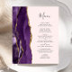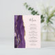 Die links Seite dieses eleganten, modernen Hochzeitsmenüs besticht durch eine lila Aquarellgrenze mit vergoldetem Imitat-Glitzer. Der anpassbare Text kombiniert handgeschriebene handgeschriebene handgeschriebene Schriftzeichen aus Holzkohle und kopperplate-Schriftart auf einem rot-rosa Hintergrund. Auf der Rückseite ist ein lila und goldenes Design zu sehen.