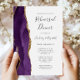 Die links Seite dieses eleganten, modernen Hochzeitsgeschehens mit Probe besticht durch eine lila Aquarellgrenze mit vergoldetem Imitat-Glitzer. Der individuell anpassbare Text kombiniert handgeschriebene Holzkohle, Kupferplatte und kursiv Schriftart auf weißem Hintergrund. Auf der Rückseite ist ein lila und goldenes Design zu sehen.