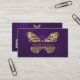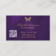 Ein eleganter, tiefer lila Hintergrund mit einem vergoldeten Schmetterling aus Imitaten. Die lila Farbe ist ungleichmäßig. Personalisieren Sie Ihren Namen auf der Vorderseite und fügen Sie ihn hinzu. Zurück: Vorlagen für Ihren Namen, Titel, Telefonnummer, E-Mail und Website-Adresse, QR-Code. Ideal für Unternehmerinnen, Berater, Geschäftsinhaber.