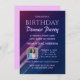 Individuelle Party Einladung zum Abendessen mit lila und blauem Farbverlauf. Features voll editierbare Zeilen, um für Geburtstagsparty oder jede Gelegenheit personalisieren, einschließlich Gast der Ehre Foto, Party Details, UAWG, und mehr Informationen. Verfügbar für Druck und sofortigen Download.