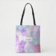 Tote Tasche mit einem schönen künstlerischen Gemälde. Erstellt mit fließenden Alkoholfarben. Lila, grüne und blaue Farben fließen zusammen. Dünne, gewellte Goldbänder vermischen sich mit diesen sanften sanften Farben. Ein weißes Rechteck mit einem goldenen Imitat-Rahmen, oben mit dem personalisierten Namen.