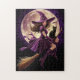 Eine schöne Hexe mit langbraunem Haar, die ein lila Kleid und einen spitzen Hut trägt, fliegt auf einem Besenstiel vor einem großen Vollmond. Die Hexe hat einen selbstbewussten Ausdruck und hält sich mit einer Hand am Besenstiel fest, während ihre andere Hand angesagt Erholungen trägt. Eine schwarze Katze sitzt hinter ihr auf dem Besenstiel, und eine Fledermaus fliegt in der Ferne.
