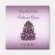 Moderner Hochzeitstorte lila mit weißen Polka-Punkten und einem Schokoladenbogen. Ein schattiger lila Hintergrund betont Namen und Hochzeitstermin.
