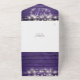 Alles in einer Hochzeitseinladung mit hübschen Saitenlichtern, einer handgezeichnet Blumengarten und schicker Typografie auf rustikalem lila Holzpaneelenboden. Die Einladung beinhaltet ein perforiertes UAWG mit Ihrem Hochzeitswebsite QR Code und Details. Entwickelt von Thisisnotme©