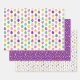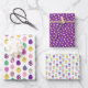 Ostereier und Hühner zum Thema Ostereier verpacken Papierblätter mit Ostereiern, Gelbhühnern, Punkten und Tulpen in lila, rosa und Minze für Ihre Osterveranstaltungen, wie Ostereierjagden, Ostergeburtstage und Osterbabyduschen. Lila Osterverpackungspapier Set von drei Mustern, eins mit Ostereiern und Gelbküken, eins lila mit Pastellpunkten und eins mit Pastelltulips in Rosa, lila und Gelb.