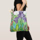 Eine weiche, hübsche Tasche mit lila Iris-Blume und einem Rahmen mit rosa Rosen, die in Stift und Tinte gezeichnet und mit Aquarellfarbe mit grünem und blauem Hintergrund gestrichen sind. Eine hübsche Tasche für den täglichen Gebrauch oder ein tolles Geschenk für einen Gärtner! Das Design stammt aus meinem Farbbuch "Lila's Garden: Ein Hütte Gartenfarbbuch, das auf Amazon zu finden ist.
