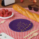 Feiern Sie Feiertage Teller. Die Teller haben ein lila und gelbes Farbschema.