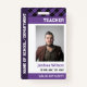 Vertikales Lehrer-ID-Abzeichen personalisiert mit Foto, Name, ID nr, Abteilung, und das Jahr, in dem das Abzeichen gültig ist in einem lila Design mit einem lila karierten Muster als kleines Detail.
