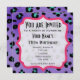 Eine Einladung perfekt für einen Geburtstag oder einen anderen Anlass. Lila Leopardenhintergrund auf beiden Seiten. Die Vorderseite zeigt schwarzen, anpassbaren Text in einem Rahmen aus rosa Klammern.
