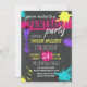 Coole Paintball-Party Einladung mit Farbspatter vor dunklem Hintergrund in lila, heiß rosa, gelb und türkis.
