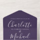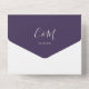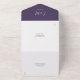 Alles in einer Hochzeitseinladung mit elegantem Schriftnamen und Monogramm-Initialen auf lila Hintergrund. Die Einladung enthält eine perforierte RSVP-Karte mit Ihrem Hochzeitswebseiten QR Code und Details. Entwickelt von Thisisnotme©