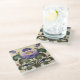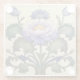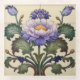 Eine symmetrische Blütenanordnung mit einer großen lila-weißen Mama als Brennpunkt, umgeben von grünen Blätter und kleineren Knospen, Set vor einem cremefarbenen Fliesenhintergrund.