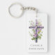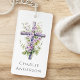 Schlüsselanhänger mit einem Aquarellkreuz mit violetten Blumen, und Ihren Namen oder benutzerdefinierten Text unten.