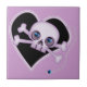 Niedlicher lila Schädel und Kreuzknochen ist Set auf einem schwarzen Herz mit einer lila neonischen Kontur und Zugkette.