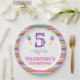 Lila Nummer Fiesta 5. Geburtstagsplatte Girls fiesta Thema 5 Geburtstag Papier Platte mit einem bunten Streifen Muster, große lila Zahl, einige Maracas und einige bunte Text.