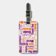 Mit einem Gepäckanhänger, der mit lila und orangefarbenen Schriftzeichen gestaltet ist, heben Sie sich von der Masse ab. Danke, dass Sie in mehreren Sprachen und in einer Vielzahl von Schriftzeichen auf weißem Hintergrund geschrieben haben.
