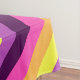 Eine 52" x 70" Tischdecke mit einem niedlichen, farbenfrohen Muster aus diagonalen Streifen in Pflaume lila, Lavendel, Zitronengelb, Melonorange und heller Magenta.