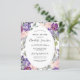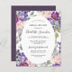 Elegantes florales Design mit rosa Rosen und lila Wildblumen schaffen einen Rahmen, der Ihre Brautparty Details umgibt. Der Name der Braut ist in einem trendigen Skript geschrieben. Die Rückseite der Einladung ist tief lila.