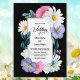 Eine lebendige, schwarz-borderierte blumengeschmückte Einladung mit rosa und violetten Blumen, weißen Gänsebläschen und Grünpflanzen, die den Text umgeben. Ideal für eine Gartenhochzeit.