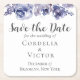 Ein eleganter Blumenrahmen mit lila Rose in Aquarell umrahmt diesen schicken Winterhochzeit-Save the Date mit einem wunderschönen botanischen Rahmen aus violetten Blume und Blätter.