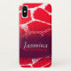 Helles Tier gemusterte Telefonzelle in fett roten, weißen und lila Farbtönen. Personalisieren Sie dieses Objekt mit Ihrem vollen Namen. Dieses Beispiel lautet derzeit: Jasmina Henderson. Ursprüngliches Muster-Design von Sarah Trett basiert auf dem Muster, das auf einer Giraffe mit einem halbmondförmigen Punkteverstärker-Muster-Overlay gefunden wurde.
