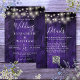 Diese lila rustikale Stallholz-Saitenleuchten Hochzeitseinladung kann mit Ihren Informationen in der modernen Typografie und Hochzeitswebsite QR-Code auf der Rückseite personalisiert werden. Entwickelt von Thisisnotme©
