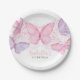 Butterfly 1. Geburtstag Party Papier Teller. Mit rosafarbenen und Lila Schmetterlingen und rosafarbenen, kursiven Schriftzeichen zum süßesten Schmetterlingsthema für das 1. Party Ihres kleinen Mädchens.