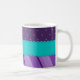 Moderne Kaffee-Tasse mit einer lila Blume, Türkisösenband auf einem lila Polkapunkt und Streifenhintergrund. Fertigen Sie ihn besonders an, indem Sie Text addieren, wenn Sie wünschen.