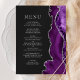 Das elegante, moderne Hochzeitsmenü mit lila Aquarellrahmen und Imitaten mit silberfarbenem Glitzer liegt am rechten Rand. Der anpassbare Text kombiniert silbergraue römische Serifen- und Copperplate-Schriftart auf schwarzem Hintergrund. Auf der Rückseite ist ein lila und silberfarbenes Design erkennbar.