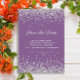 Elegante lila Hochzeit Speichern Sie die Date-Karte mit funkelnd silbernen Glitzer. Personalisiert mit den Namen der Braut und des Bräutigams und ihrem geplanten Hochzeitstag und Ort.