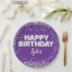 Lila und silberne Geburtstagsparty-Teller für ein lustiges Party mit einem modernen klassischen Look mit Glitzer- und Folienballons auf personalisierten Papier-Tellern.