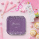 Elegand lila Brautparty 7" quadratische Teller mit glänzenden silbernen Glitzer. Personalisiert mit dem Namen der Braut und ihrem Duschdatum.