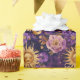Ein atemberaubendes himmlisches Blumendesign, das mystische Sonnen, Monde, Sterne und charmante Blume in lila und goldenen Tönen präsentiert. Blumenbestandteile verschmelzen mit leuchtenden Himmelsmotiven vor einem skurrilen lila Hintergrund, ideal für Bewunderer des mystischen und himmlischen Charmes.