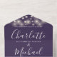 Alles in einer Hochzeitseinladung mit hübschen Saitenlichtern, elegantem Schriftnamen und Monogramm-Initialen auf lila Hintergrund. Die Einladung enthält eine perforierte RSVP-Karte, die für Sie individuell adressiert oder links als leere Karte für die Handschrift der Adressdaten Ihres Gastes verwendet werden kann. Entwickelt von Thisisnotme©