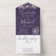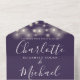 Alles in einer Hochzeitseinladung mit hübschen Saitenlichtern, Mason-Gläsern, elegantem Schriftnamen und Monogramminitialen auf lila Hintergrund. Die Einladung enthält eine perforierte RSVP-Karte, die für Sie individuell adressiert oder links als leere Karte für die Handschrift der Adressdaten Ihres Gastes verwendet werden kann. Entwickelt von Thisisnotme©