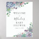 Herzlich willkommen in Ihrer Babydusche mit diesem wunderschönen Poster mit lila und grünen Sukkulenten und Grünpflanzen. Fügen Sie den Ehrengast mit dem Namen, dem Duschdatum und dem persönlichen Willkommenstext unter Verwendung der angegebenen Felder hinzu.