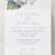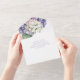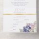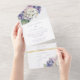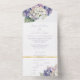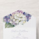 Diese romantische blumengeschmückte Hochzeitseinladung besticht durch lila und weiße Hydrangeas im Wasser. Ein zarter Strauß von Hydrangea-Blume wird vorne und zwei auf der Innenseite abgebildet.