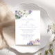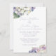 Diese romantische blumengeschmückte Hochzeitseinladung besticht durch lila und weiße Hydrangeas im Wasser. Ein zarter Strauß an Hydrangea-Blume wird oben abgebildet, ein anderer unten.