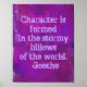 Reiche dunkle Purpur und lebhafte Pinks mischen sich und vermischen sich zu einem aufregenden, farbenfrohen abstrakten Texturdesign. Geschehen in Aquarellfarbe. Zitat geschrieben auf diesem Plakat ist von Goethe. Es lautet: Der Charakter wird in den stürmischen Linien der Welt geformt.