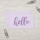 Hübsche und elegante Visitenkarten mit einem schlichten und trendigen Aquarell hallo Typografie-Design in einem lila Design auf einem Lavendelhintergrund. Ändern Sie die Hintergrundfarbe und die Farbe des Textes auf der Rückseite für ein benutzerdefiniertes Aussehen. Entworfen mit Haarstylisten, Kosmetologen, Make-up Künstlern und anderen kreativen Profis im Hinterkopf.