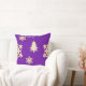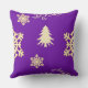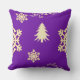 Ein buntes, lila Weihnachtskissen mit Schneeflocken, Weihnachtsbäumen und Wirbel, verstreut über einen festlichen lila Hintergrund.