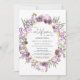 Lila Wildblume Kinderdusche Einladung. Das ist eine Einladung zu einer Babydusche mit einem goldgelben romantischen Kranz aus Grün und lila Lavendel-Wildblumen. Matching-Spiele finden Sie in der Lila Wildblume Baby Shower Collection.