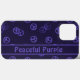 Das Smartphone-Gehäuse für zufällige Friedenszeichen-Muster in lila mit bearbeitbaren Textfeldern für eine einfache Anpassung an Ihren Namen oder Ihre Nachricht.