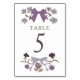 Boho und rustikale Hochzeitsstiftung Tischnummer mit handgezeichneter Illustration von Bändern mit Blume in lila Farbe.