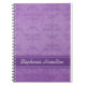 Lilac Damask Notizbuch mit elegantem Damast-Muster überall und einem horizontalen lila Streifen in der Nähe der Unterseite, um Ihren Namen zu schreiben.