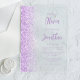 Die links Kulisse dieser eleganten, modernen Hochzeitseinladung besticht durch einen lockeren, lila Imitat-Glitzer. Der anpassbare Text kombiniert lilac-Skript und sans serif-Schriftart auf einem klaren Hintergrund.