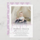 Invitation au baptême minimaliste en avec baptême écrit dans un script de pinceau violet pâle. Ajoutez le nom et le texte en gris mou. Personnalisez avec une photo de votre bébé. Le dos est orné d'un motif violet et blanc avec croix.