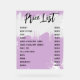 Liste de prix chic de salon panneau de prix acrylique avec des traits de peinture violet clair et de la peinture blanche spatter imprimé contre l'arrière - plan acrylique transparent avec des polices de charme avec un look lettré à la main pour votre salon ou petite entreprise. Panneau de prix pour petite entreprise imprimé sur acrylique avec des détails de peinture lilas et blanc pour un look chic, parfait pour les salons de cheveux, maquilleurs, techniciens d'ongles, et professions similaires.